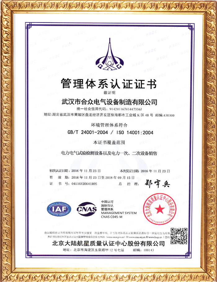 热烈祝贺武汉市合众电气设备制造有限公司,职业健康安全管理体系符合GB/T 28001-2011/ OHSAS 18001:2007和环境管理体系符合GB/T 24001-2004/ ISO 14001:2004。