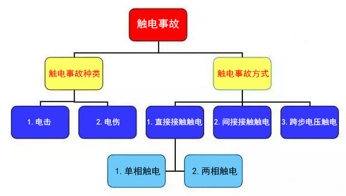 人体不同部位接触不同电位则有电流流过为触电。分为“电击”与“电伤”两类。