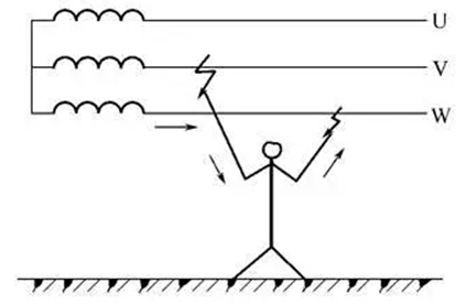 两相触电是指人体同时接触设备或线路中的两相导体而发生的触电现象。若人体触及一相火线、一相零线,人体承受的电压为220V;若人体触及两根火线,则人体承受的电压为线电压380V。两相触电对人体的危害更大。