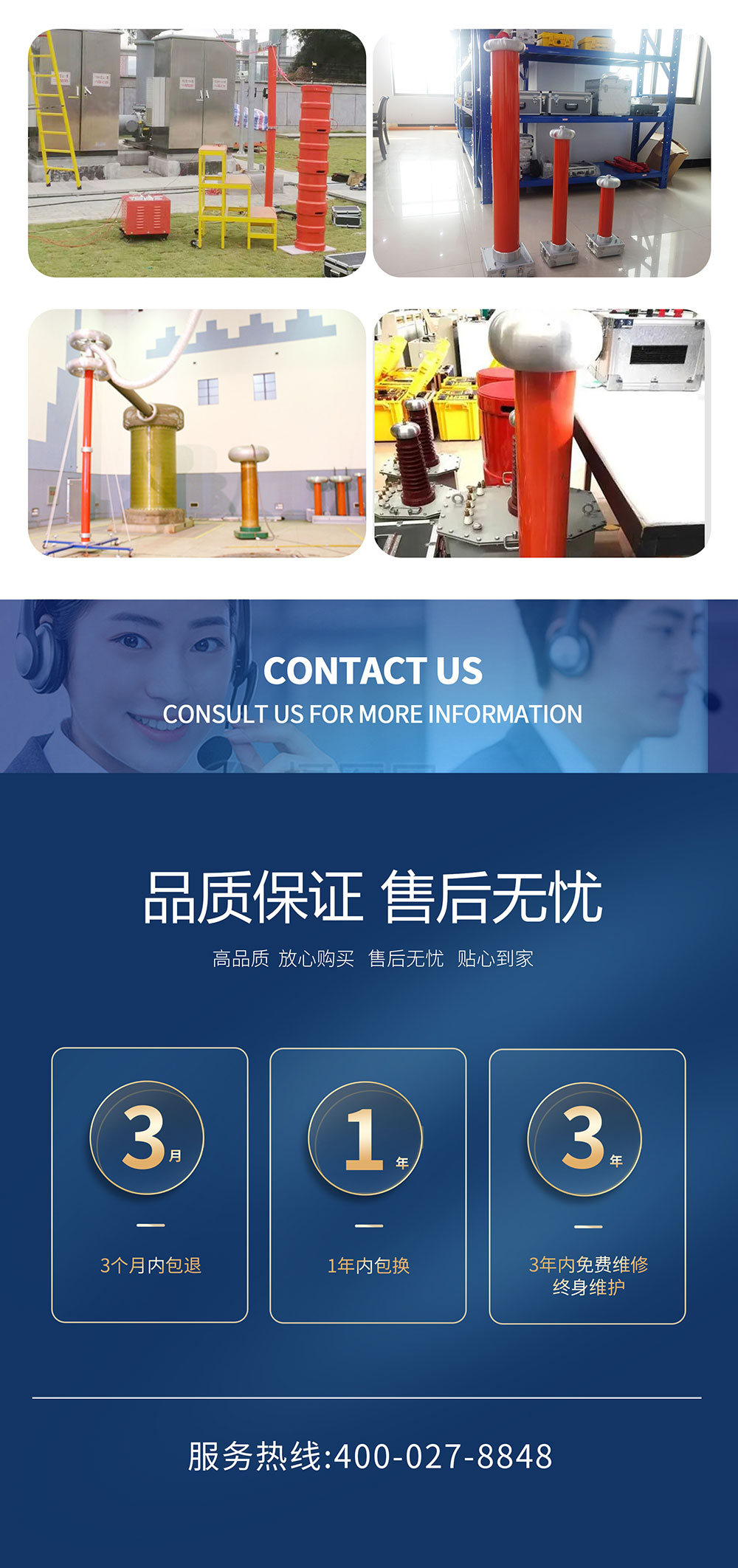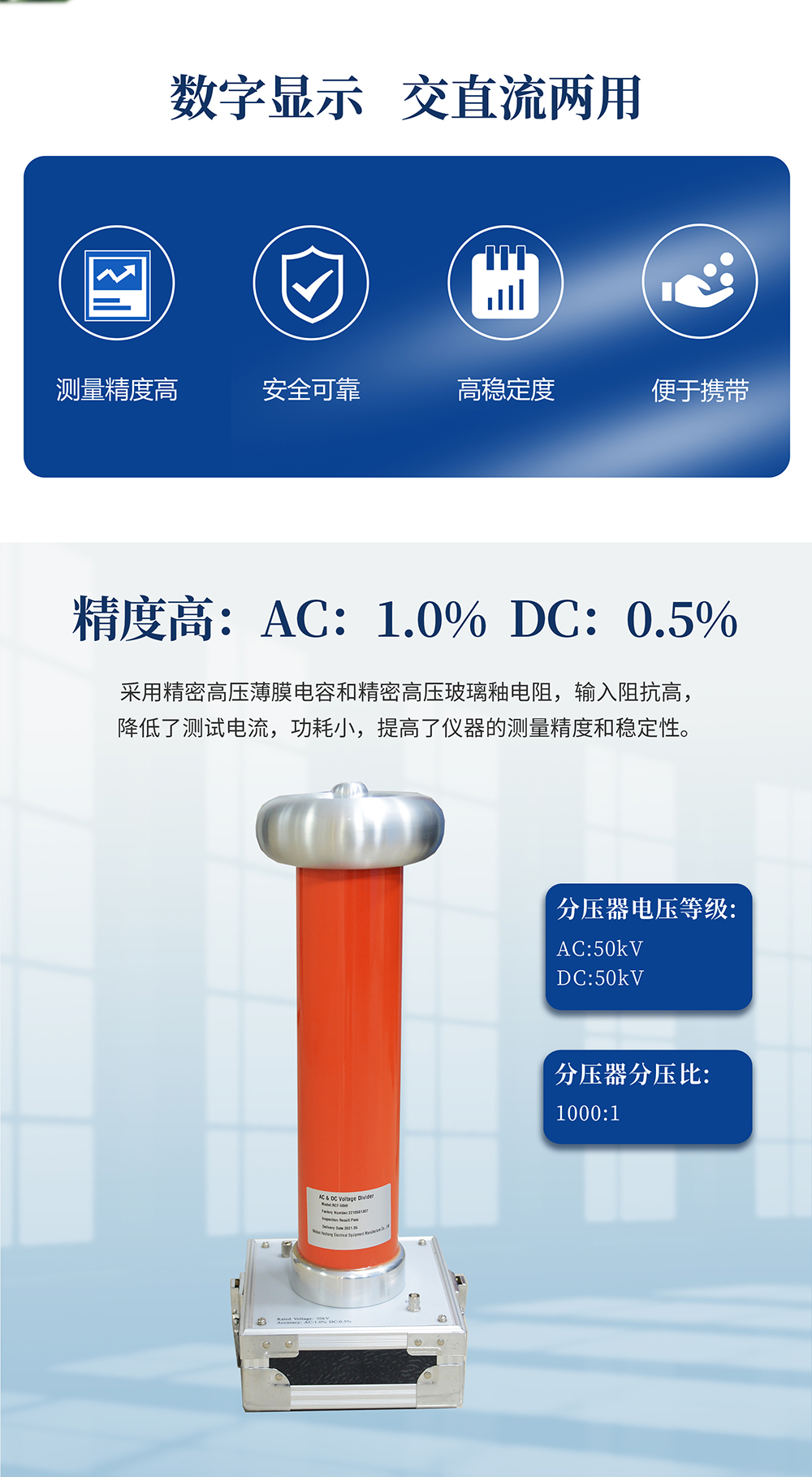 本产品作为高电压测量之理想设备,主要用于电力系统及电气电子设备制造部门测量工频交流高电压和直流高电压。本仪器由高压分压器和低压显示表两部分组成,两者采用配套电缆连接使用。