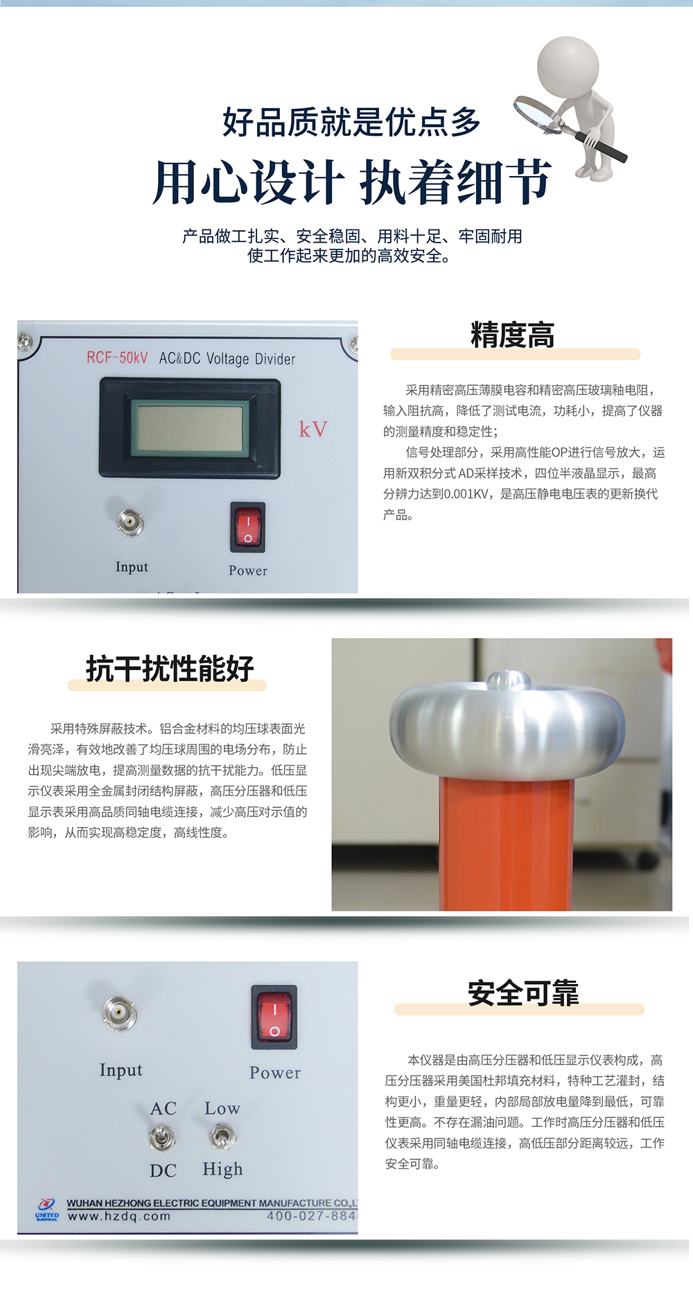 采用特殊屏蔽技术。铝合金材料的均压球表面光滑亮泽,有效地改善了均压球周围的电场分布,防止出现尖端放电,提高测量数据的抗干扰能力。低压显示仪表采用全金属封闭结构屏蔽,高压分压器和低压显示表采用高品质同轴电缆连接,减少高压对示值的影响,从而实现高稳定度,高线性度。