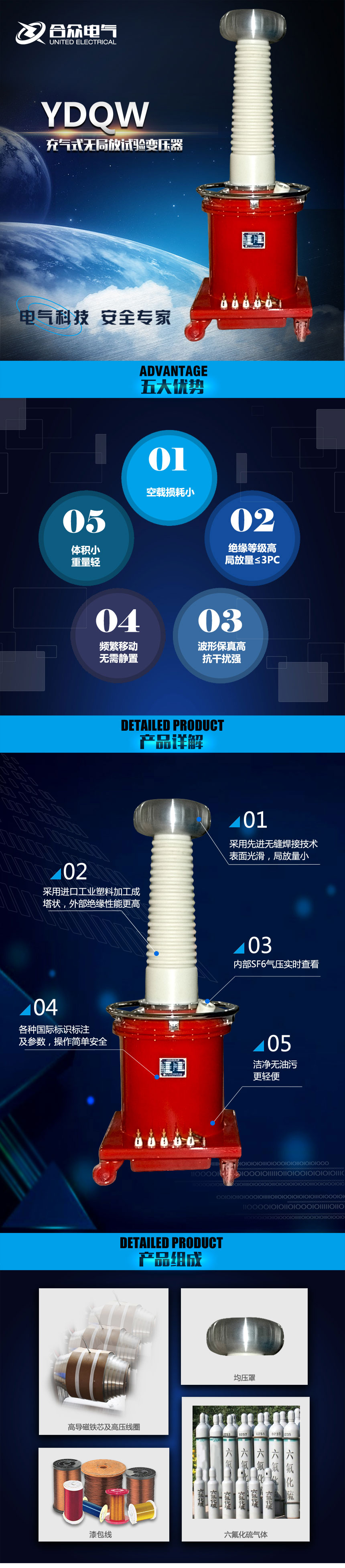 无局放试验变压器(充气式),是合众电气经过多年的努力,研究成功的充气式无局放轻型试验变压器,无油污染,单台试验变压器的电压等级可达300KV。由于采用了新的生产工艺,产品的技术性能有较大的提高,特别适用于现场工作及频繁移动的工作条件下使用。