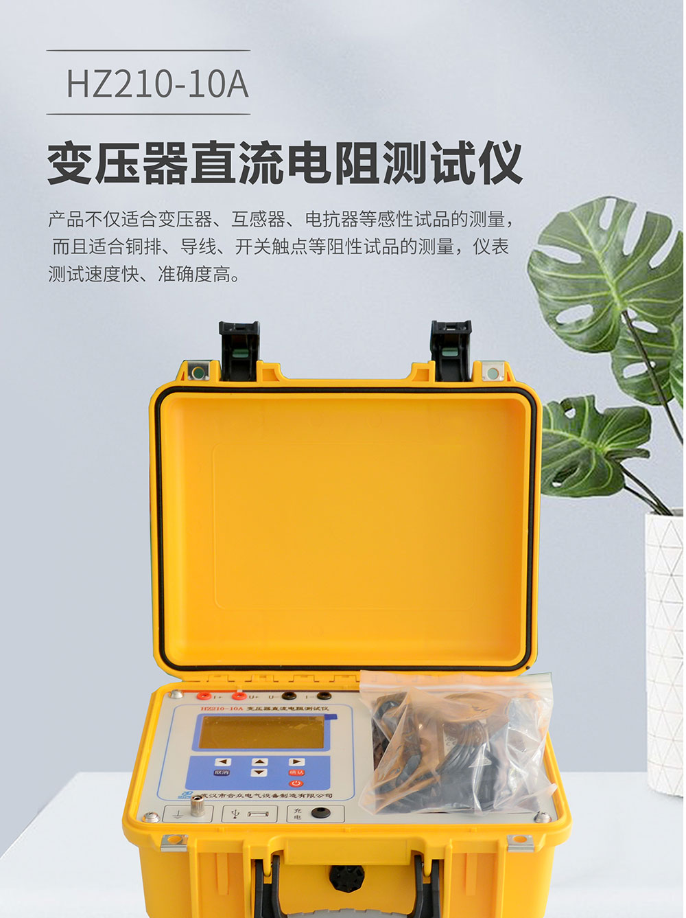 直流电阻测试仪 HZ210-10A 变压器直流电阻测试仪是一款创新型产品,内置大容量锂电池,仪器与测试线采用机线一体设计,产品体积小巧,便于携带。产品不仅适合变压器、互感器、电抗器等感性试品的测量,而且适合铜排、导线、开关触点等阻性试品的测量,仪表测试速度快、准确度高。