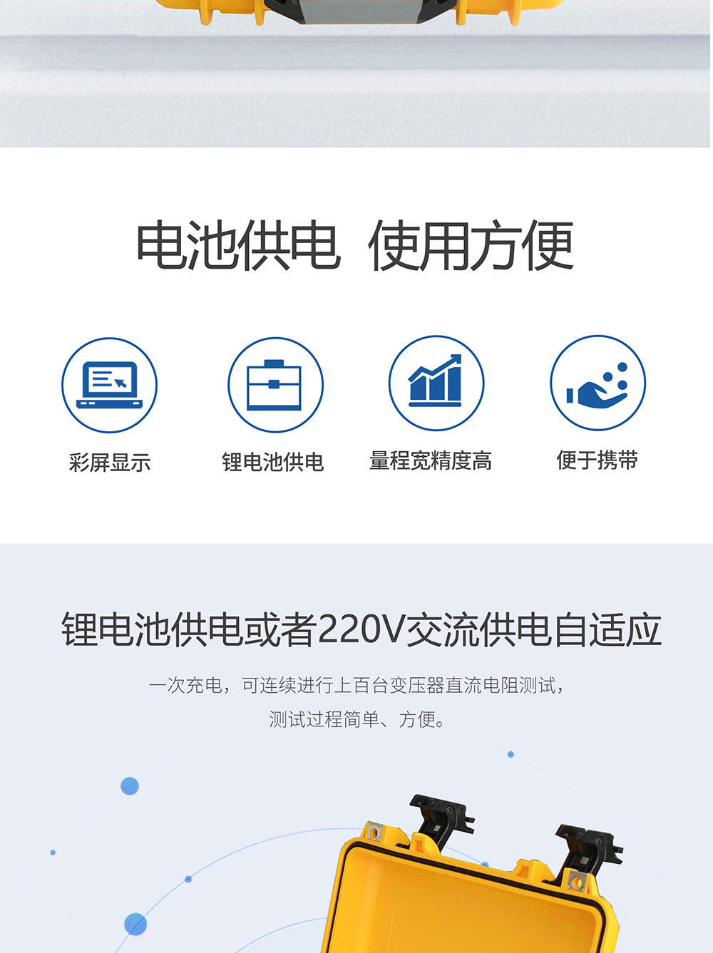 1、锂电池供电或者220V交流供电自适应,一次充电,可连续进行上百台变压器直流电阻测试,测试过程简单、方便。