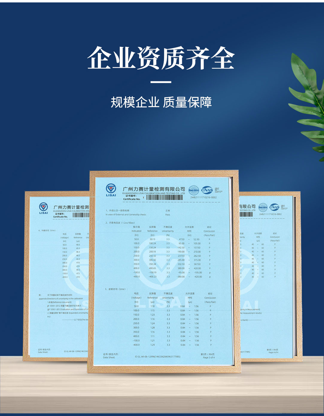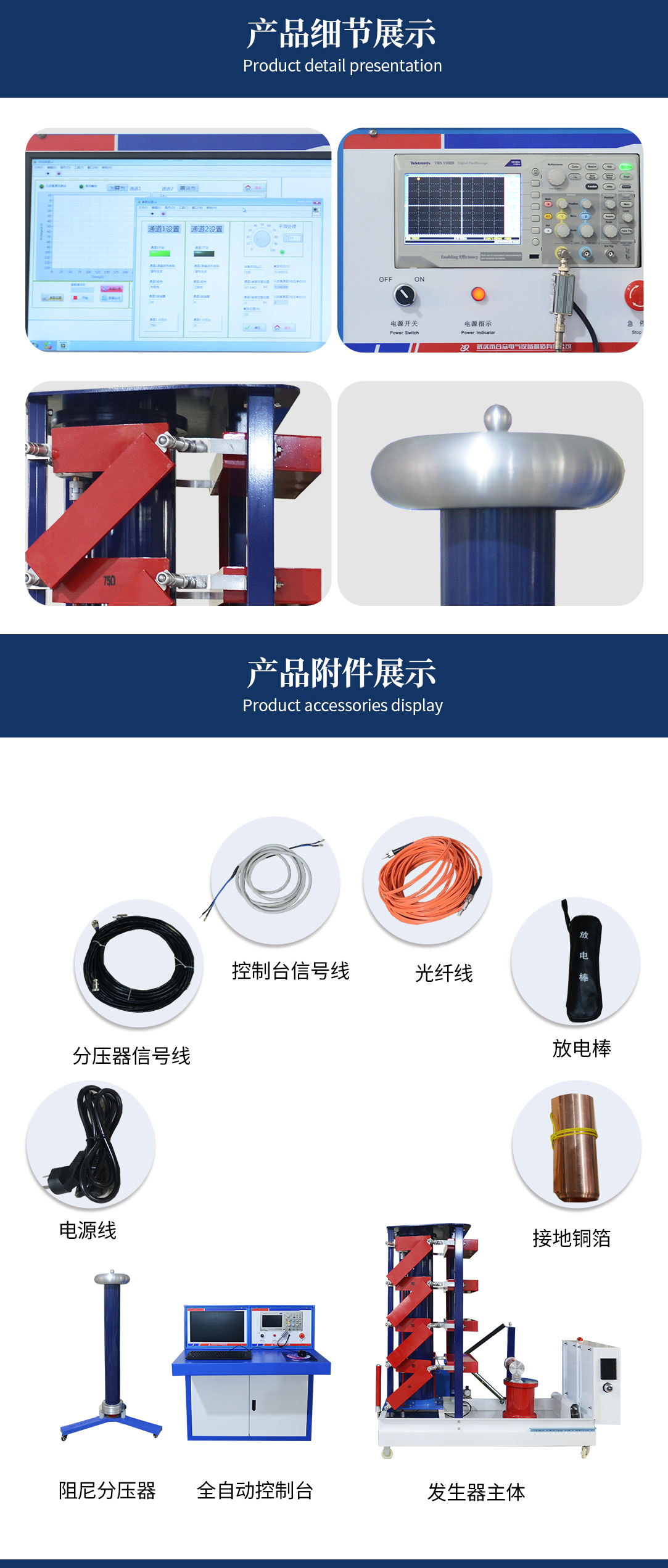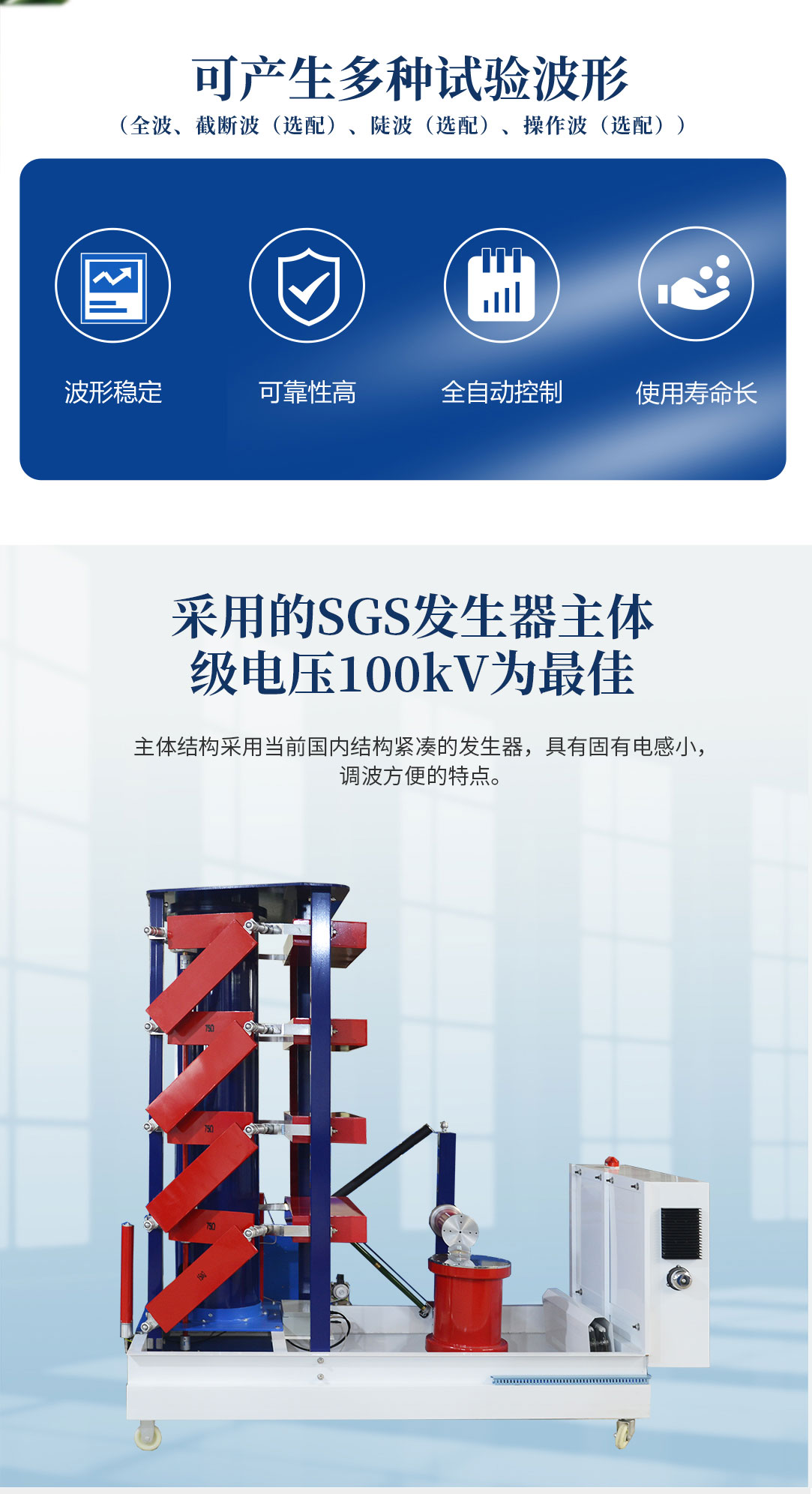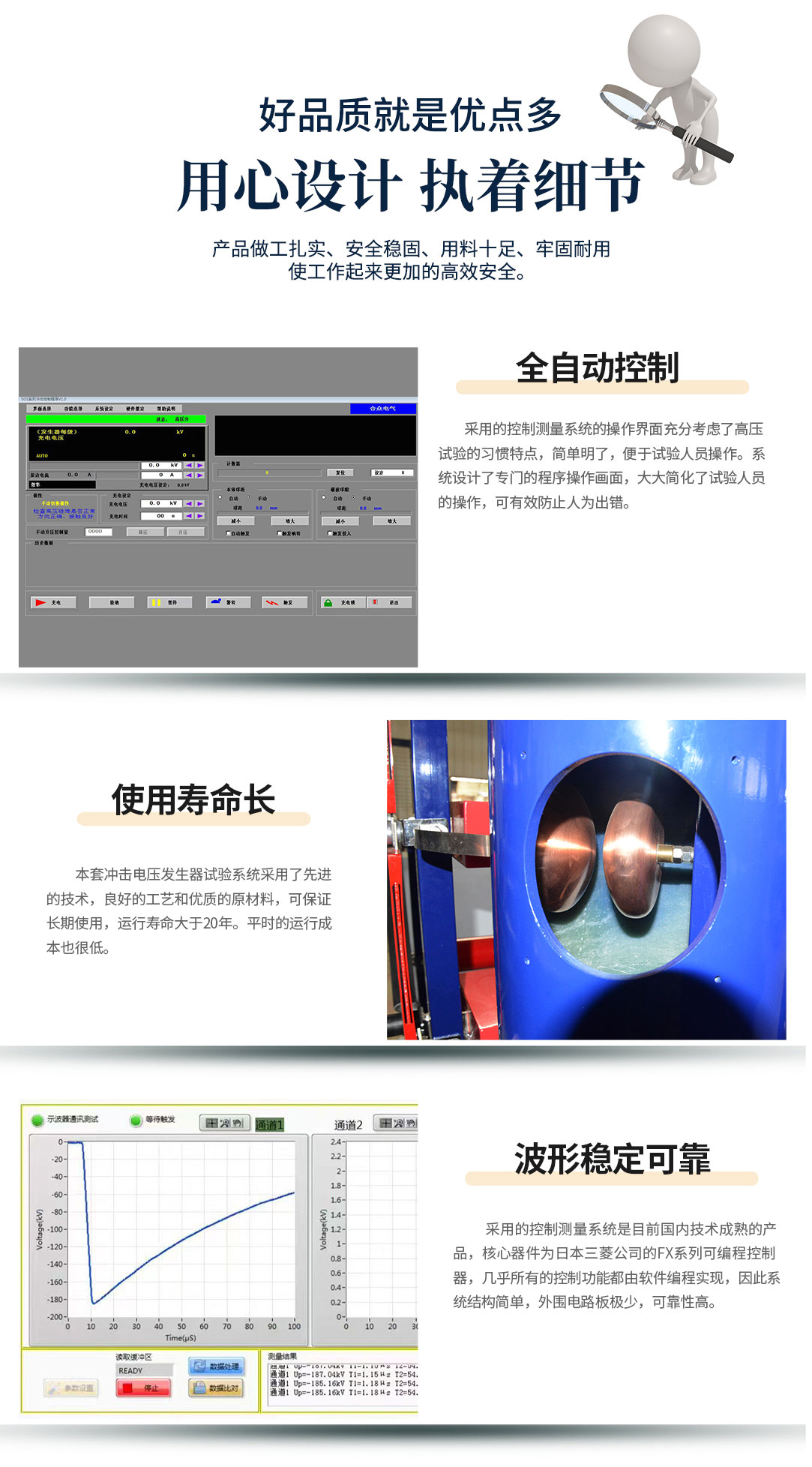 波头时间:1.2±30%μs,波尾时间:50±20%μs,过冲:小于5%,效率:不低于90%?!?.2/50μs标准雷电冲击电压全波,效率大于90%。