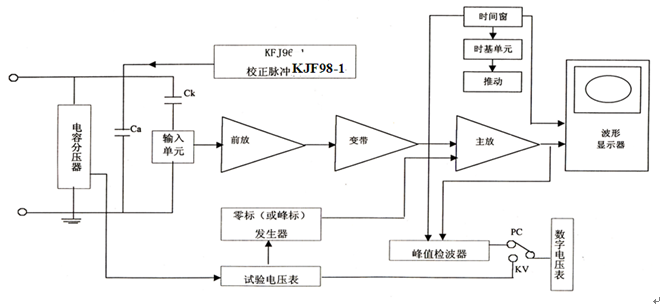 试品Ca在试验电压下产生局部放电时,放电脉冲信号经藕合电容Ca送入输入单元,由输入单元拾取到脉冲信号,经低噪声前置放大器放大,滤波放大器选择所需频带及主放大器放大(达到所需幅值与产生零标志脉冲)后,在示波屏的椭圆扫描基线上产生可见的放电脉冲,同时也送至脉冲峰值表显示其峰值。