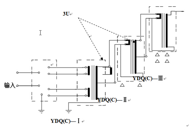 YDQ(C)系列高压试验装置,除最高电压一级外,都在高压绕组中串绕激磁组。该绕组和后一级试验变压器初级线圈参数相同。