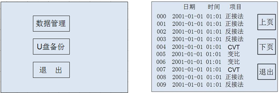 在主菜单点击“数据管理”进入数据管理界面(如图5-9),点击“数据查询”进入。进入数据存放菜单(如图5-9)后,按上、下键移动光标至想要查看的数据项目上,(仪器所保存的数据均是按照测量时间的先后所排列的,第000个数据即最新数据,第199个数据即最老数据。)再点击相应的数据,进入数据打印项目,在此菜单里面可以按上,下键翻页至相应的数据序号上,可对数据进行打印操作。
