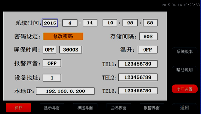 系统参数设置包括:日期、记录间隔、密码设定、网口通讯IP设定、蜂鸣器报警、温升、屏保、设备地址。