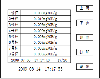 轻触屏幕上的“上页”、“下页”键,可以查找测试过的结果,轻触“打印”键,可以打印页面显示内容;轻触“退出”键,即退出显示界面。