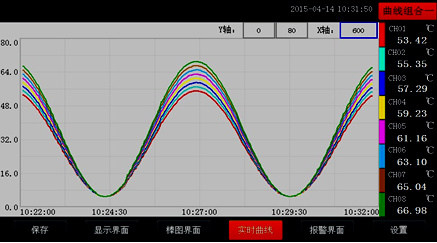 当前曲线记录只保留单屏的显示数据,可根据观察的需要,通过改变Y轴和时标X轴来改变显示刷新的速度,各条曲线一致,并不影响FLASH记录的时间间隔。