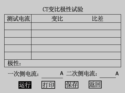 互感器综合特性测试仪检查接线完成后,选择开始试验选项并按下旋转鼠标,进入变比极性测试界面,如图3.20所示。进入变比极性测试界面后,将光标移动至运行选项并按下旋转鼠标,仪器自动进行变比试验。互感器综合特性测试仪CT变比极性试验结果操作界面显示如图3.21所示,在变比极性试验过程中,选择停止选项并按下旋转鼠标,可提前终止试验。
