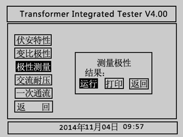 在CT测试主界面中光标选择极性测量选项,点击旋转鼠标进入CT极性测量界面如图3.22所示。CT极性试验接线与CT变比极性试验接线方式相同,按下互感器综合特性测试仪运行后,仪器会自动检测所连接CT的极性。选择打印选项则将试验结果打印,选择返回选项则返回至CT试验主界面。