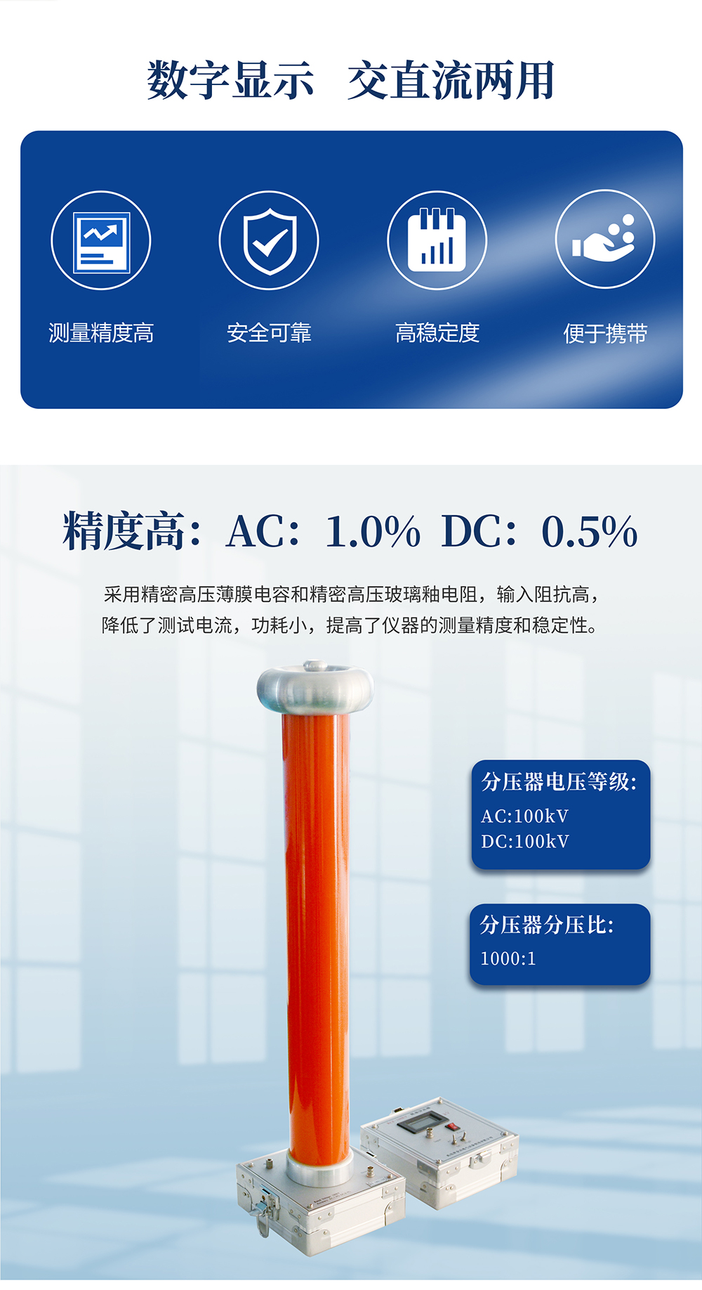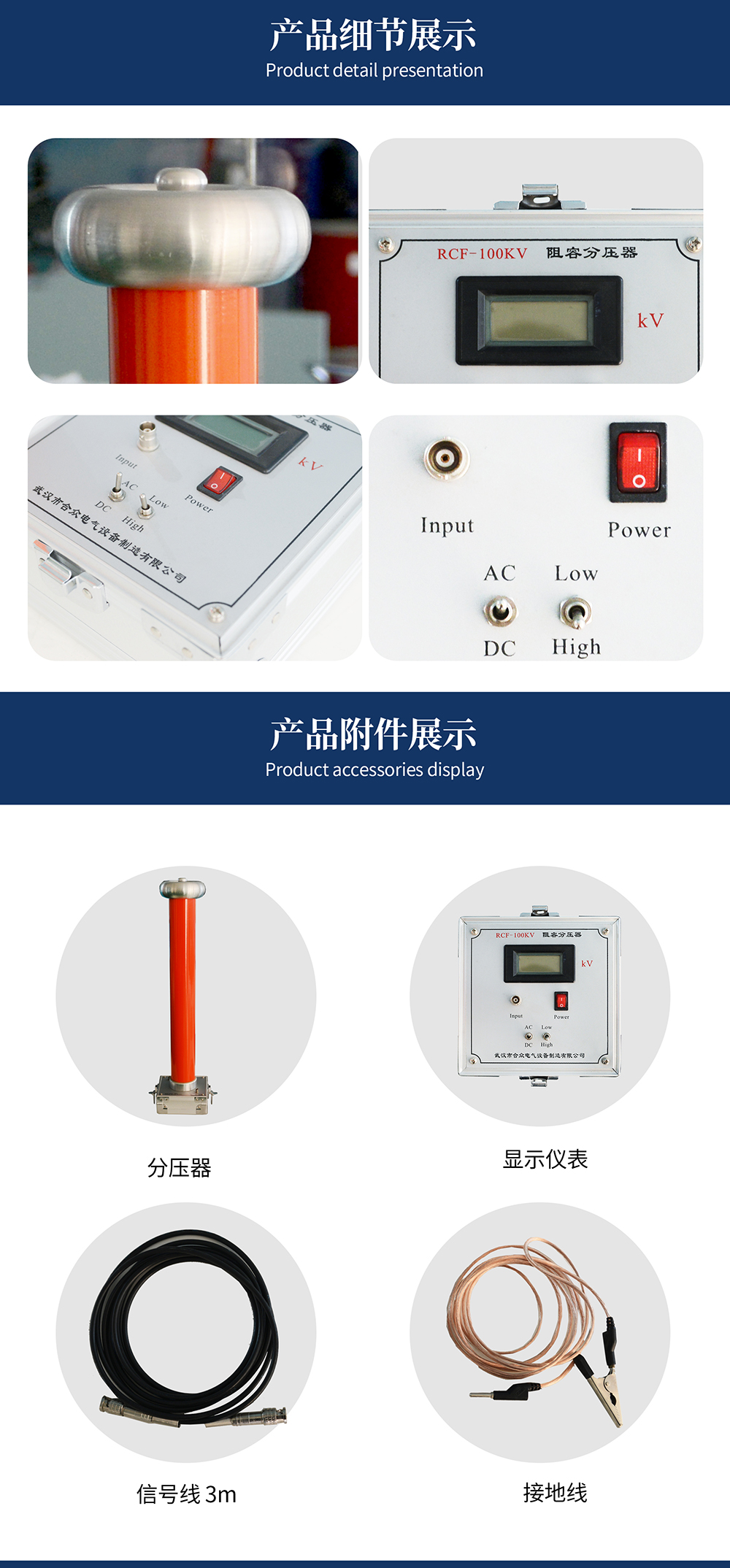 本仪器是由高压分压器和低压显示仪表构成,高压分压器采用美国杜邦填充材料,特种工艺灌封,结构更小,重量更轻,内部局部放电量降低,可靠性更高。不存在漏油问题。工作时高压分压器和低压仪表采用同轴电缆连接,高低压部分距离较远,工作安全可靠。