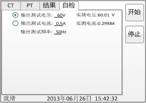 智能互感器测试仪自测界面如图1。在万用表帮助下,自测功能可用于检查设备是否损坏,测量电路是否正常。