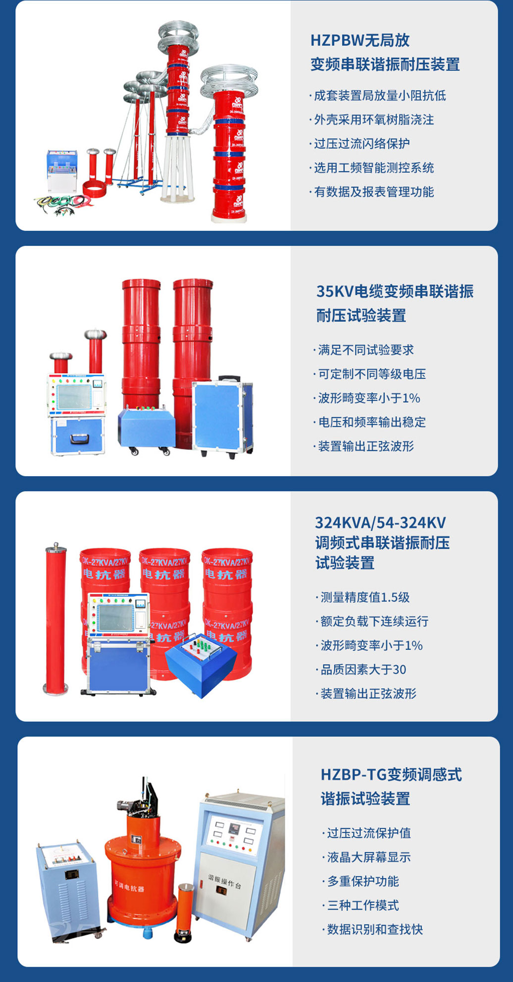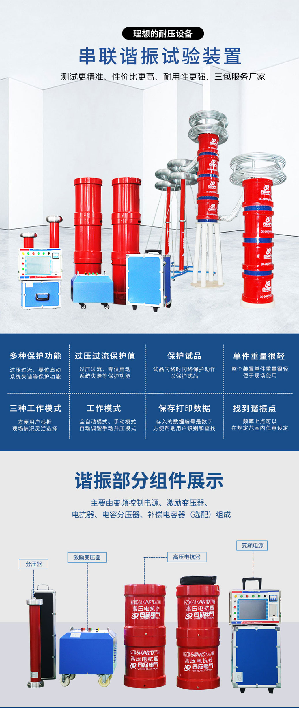*串联谐振试验装置主要针对交联电缆、水力发电机、主变、母线、GIS等的交流耐压试验,具有较宽的适用范围,是地、市、县级高压试验部门及电力安装、修试工程单位理想的耐压设备。