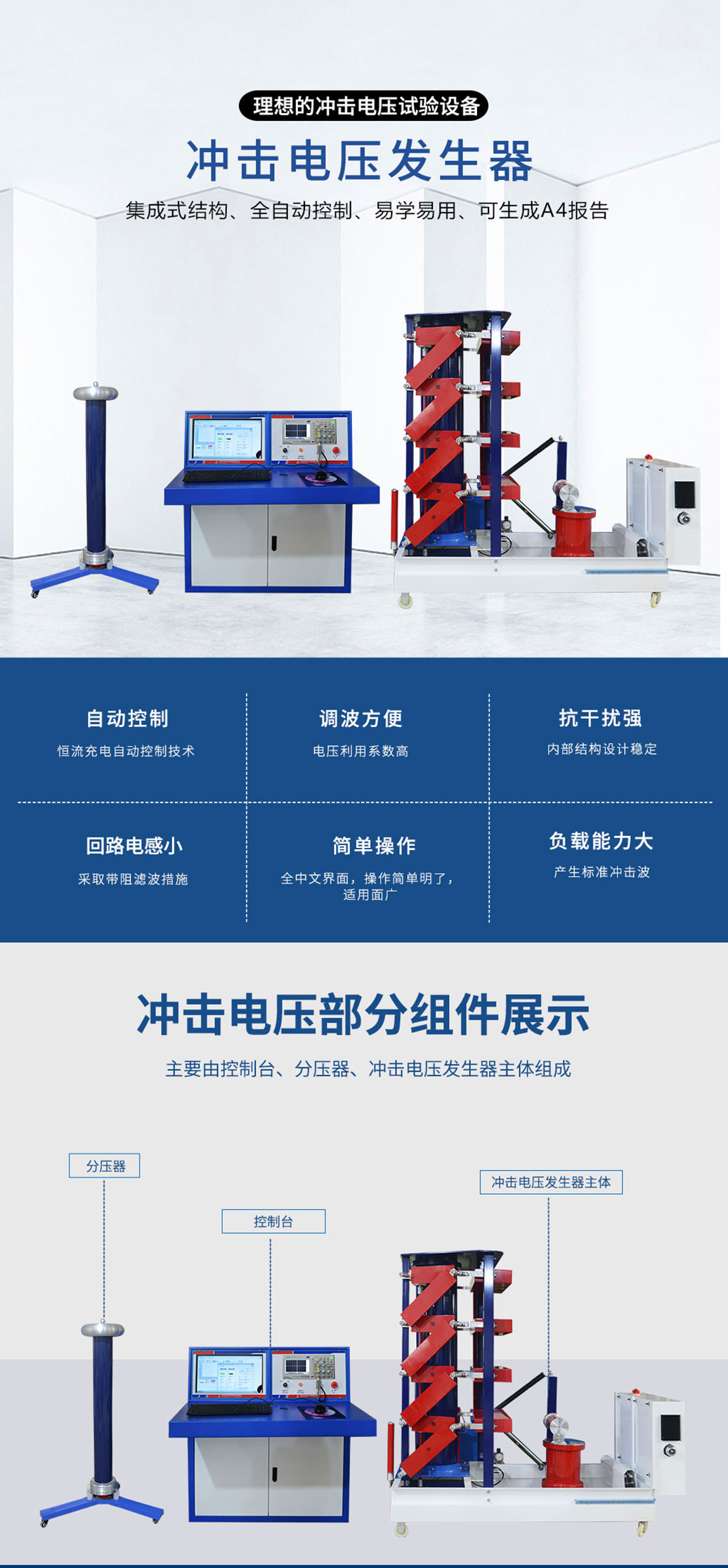 主要用于电力设备等试品进行雷电冲击电压全波、雷电冲击电压截波和操作冲击电压波的冲击电压试验,检验绝缘性能。