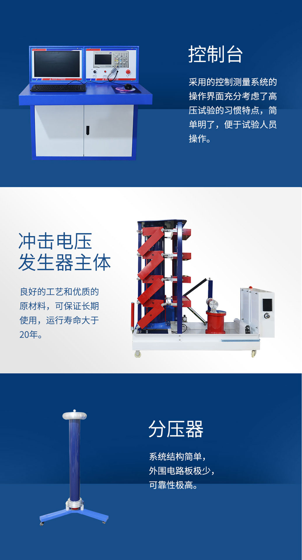 发生器本体、截波、分压器、四组件控制台(控制台分为微机型和普通型)、数字化波形记录系统等组成。