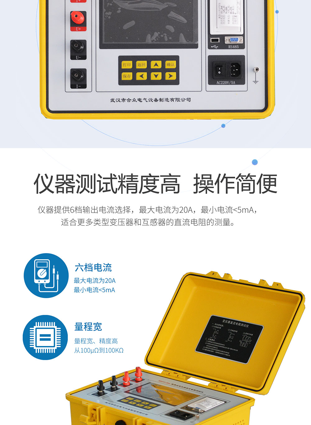 1、仪器提供6档输出电流选择,最大电流为20A,最小电流<5mA,适合更多类型变压器和互感器的直流电阻的测量。