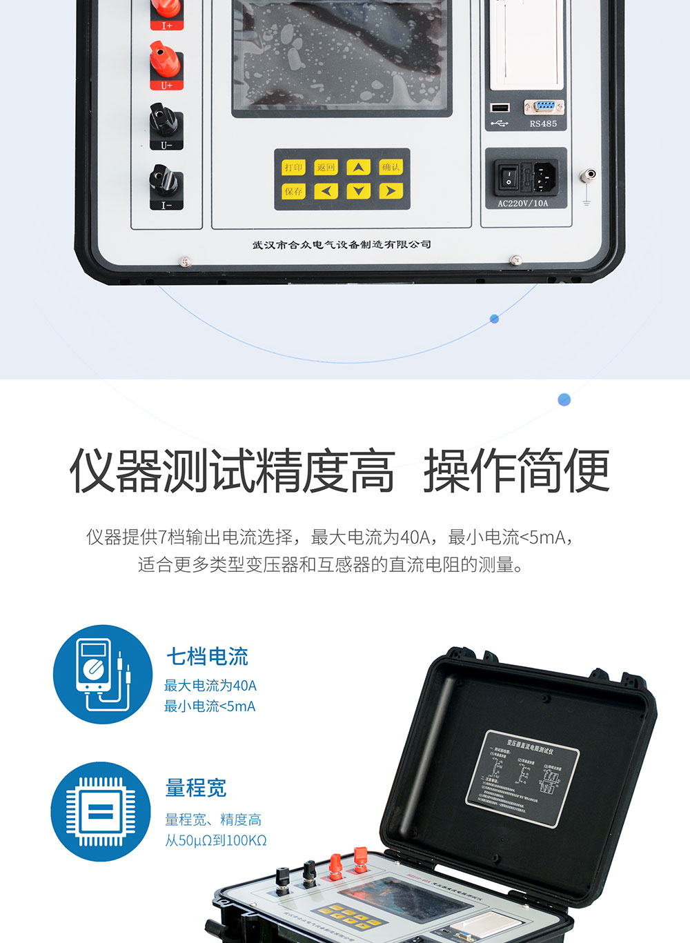 1、仪器提供7档输出电流选择,最大电流为40A,最小电流<5mA,适合更多类型变压器和互感器的直流电阻的测量。