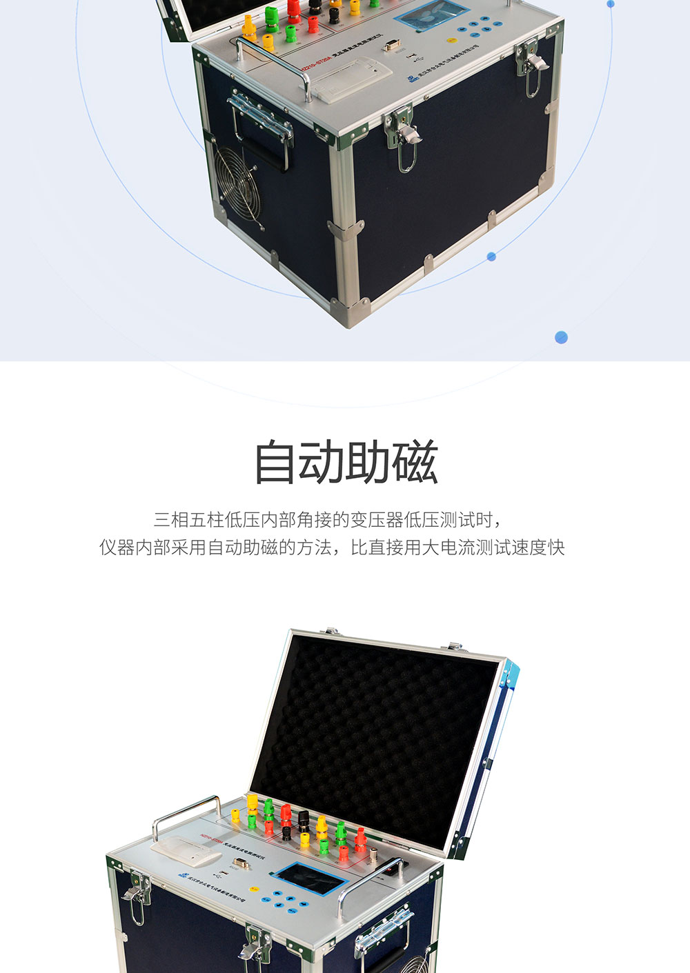 3、三相五柱低压内部角接的变压器低压测试时,仪器内部采用自动助磁的方法,比直接用大电流测试速度快;