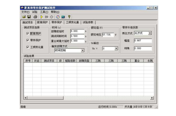 时间参量:故障前延时该时间常用于等待每次动作后?;ふ楦垂椋蛘摺癟V 断线”信号消失,或者等待重合闸充电。若仅做?;ざㄖ挡馐远煌度胫睾险?,这个时间一般设为 2~10s.如果同时做重合闸试验时,则一般设为 15~25s。每进行一次故障测试,测试仪都首先进入“故障前延时”状态,输出三相额定电压 57.7V,三相电流为 0,然后再进入故障状态,输出所设置的故障量。