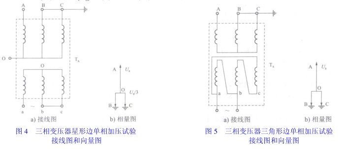 图 6 为通过星形低压侧两相并联和另一相串联单相加压,高压侧中性点接地,使高压侧被试相对地电压达到试验电压,线间电压达 1.5Us。