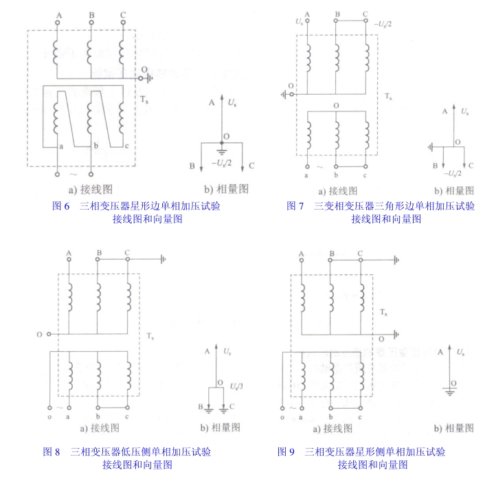 当被试三相变压器低压绕组的各端子都能引出时,可以采用图 8 和图9的接线。图 8接线只适用于三铁芯柱变压器,这种情况下,高压侧被试相相间和对地电压达试验电压 Us中性点电压达试验电压的 1/3;