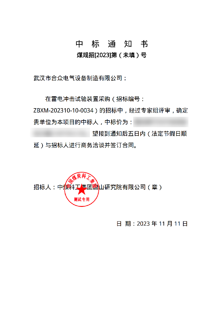 在雷电冲击试验装置采购( 招标编号:ZBXM-202310-10-0034 ) 的招标中,经过专家组评审,确定贵单位为本项目的中标人。望接到通知后五日内(法定节假日顺延)与招标人进行商务洽谈并签订合同。