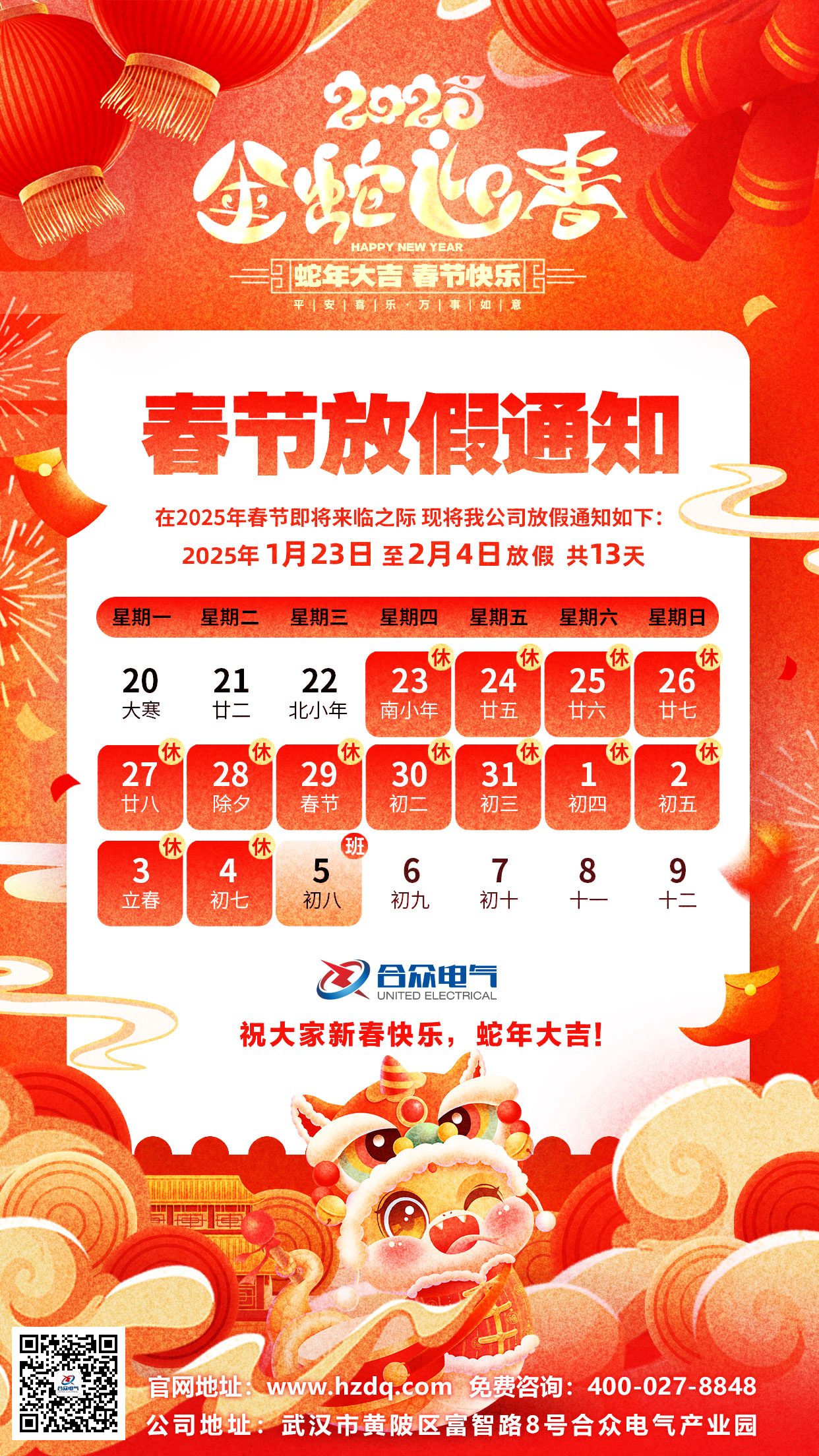 根据《国务院办公厅关于2025年部分节假日安排的通知》,结合我公司实际情况现将春节放假安排的有关事宜通知如下:一、春节放假时间:2025年01月23日至02月04日放假,共13天,02月05日(正月初八)正式上班,其中01月28月至02月04日为国家调休放假日。
