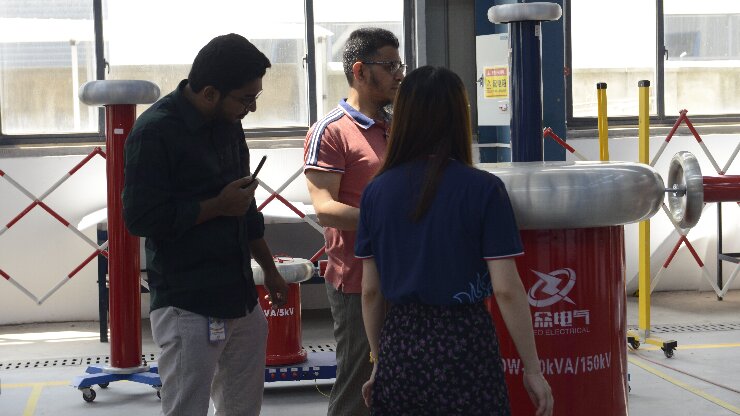 在武汉市合众电气技术团队的陪同下,孟加拉客户深入参观了智能化生产车间与高压实验室??突е氐愎勰α司植糠诺绮馐韵低车南殖⊙菔?,对其高精度检测能力与抗干扰性能表示认可;在冲击电压发生器测试区,设备稳定的波形输出与??榛杓埔⒘丝突ê裥巳ぁ?突殖”硎荆?合众电气的全流程质量控制体系与国际标准接轨,完全符合孟加拉电网试验项目的严苛要求。"