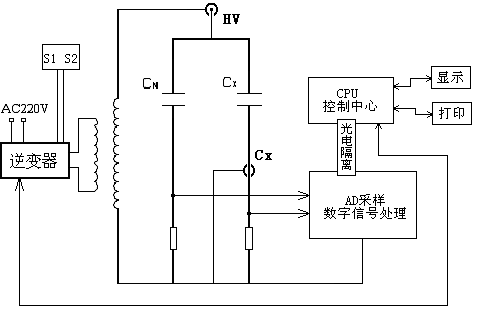 在交流电压作用下,电介质要消耗部分电能,这部分电能将转变为热能产生损耗。这种能量损耗叫做电介质的损耗。当电介质上施加交流电压时,电介质中的电压和电流间成在相角差ψ,ψ的余角δ称为介质损耗角,δ的正切tgδ称为介质损耗角正切。tgδ值是用来衡量电介质损耗的参数。仪器测量线路包括一标准回路(Cn)和一被试回路(Cx),如图1所示。标准回路由内置高稳定度标准电容器与测量线路组成,被试回路由被试品和测量线路组成。测量线路由取样电阻与前置放大器和A/D转换器组成。通过测量电路分别测得标准回路电流与被试回路电流幅值及其相位差,再由数字信号处理器运用数字化实时采集方法,通过矢量运算得出试品的电容值和介质损耗正切值。